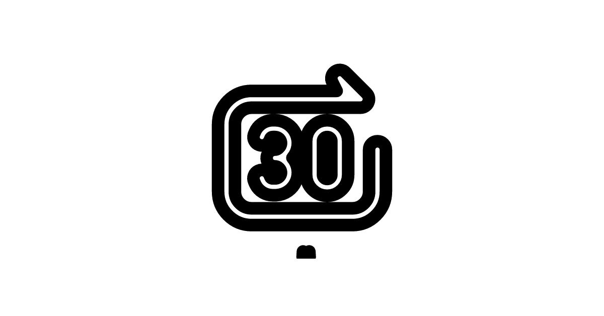 The rewind-forward-square-30-line icon symbolizes rewind/fast-forward actions for 30 seconds through media, typically presented in a line format on digital interfaces.