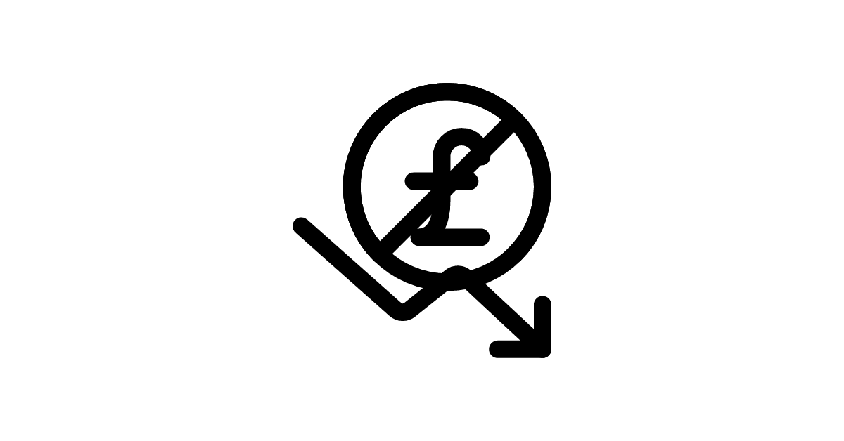 The currency-pound-decrease icon represents a decrease in Pound Sterling currency value, often used to indicate a downward trend in currency exchange rates.